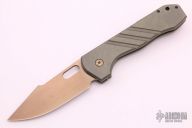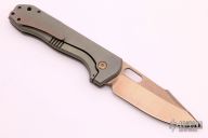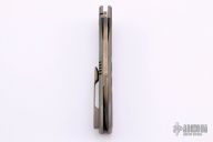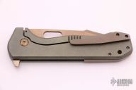This Tac 4 by Jeremy Horton features the Lee Williams Kickstop, it has a bronzed chisel ground blade with a convex grind tip and thumbhole. The handle has an anodized and tumble finished titanium frame with a matching tip up clip and backspacer. Comes with a zippered case. Has nice detent, blade seating and lockup. Excellent condition. 1 of three that were made.