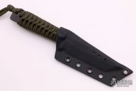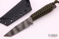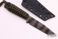This WP by Strider Knives features a tiger striped S30V blade with false top edge, .190" blade stock and .98" blade depth, full tang construction with green paracord wrapped handle. Comes with kydex sheath. Light spotting marks are visible on the blade otherwise excellent condition. Has been resharpened.