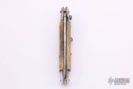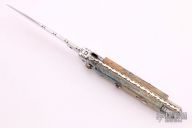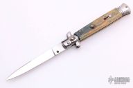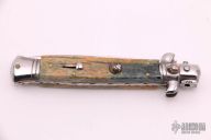 This swivel bolster auto features a polished spear point blade with a file worked blade spine.  The handle has stainless steel bolsters and butt, bone scales and brass liners. Strong opening. Has safety. Has some scratches, otherwise excellent condition.