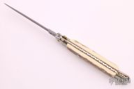 This picklock by Frank Beltrame features a Damascus blade with a dagger style blade with a false top edge. The handle has nickel silver bolsters, mammoth scales with brass liners. Patina is visible on the bolsters otherwise the knife is in good condition.