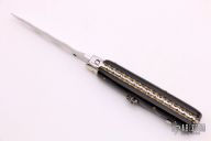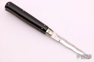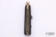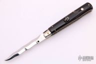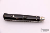 This Swivel Bolster Auto has a stainless steel spear Kris blade. The handle is composed of nickel silver bolsters, brass liners all complemented by buffalo horn scales and a skull push button. There is a chip missing from the handle next to the push button.  Excellent Condition.
