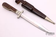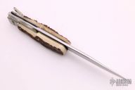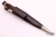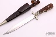 This leverlock swing guard folding boot knife by Wusthof features a polished blade with false top edge. The handle has a folding steel guard, stag scales, brass liners and a stainless steel backspacer. Includes a brown leather sheath. Scuffs and scratches are visible on the blade and handled otherwise the knife is in good condition.