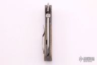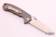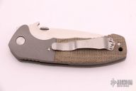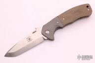 This Custom CQC-14 from Emerson features a hand-ground satin finish blade with a chisel grind, bead blasted and dovetailed titanium bolsters and liners, and green micarta scales, black G-10 backspacer. Stainless steel clip. Thumbdisc and Wave feature.  This is the custom "Long Blade" version which is not available as a production knife. Includes original box and papers. Excellent condition.