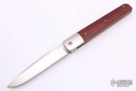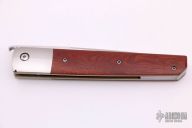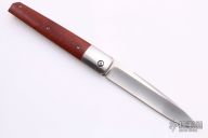 This linerlock front flipper by Jeff Harkins features a hand rub satin finished blade with swedge and front flipper. The handle has dovetailed stainless steel bolsters, wood scales, stainless steel fileworked backspacer, satin finished titanium liners. Has some light scratches, otherwise excellent condition. Comes with a zippered case.