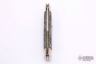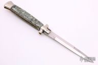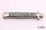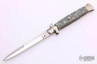 This 15" Swivel Bolster auto by Stiletto Italy features a mirror polished blade with false top edge. The handle has nickel silver bolsters, front and rear, money acrylic scales, brass liners and stainless spring and backspacer. Has some light scratches, otherwise excellent condition.  This knife does not lock up.