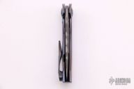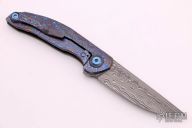 This Orso flipper by Jens Anso features a Damasteel blade with notched flipper. The handle has a fine, checker milled and zircuti frame, zirconium pivot collars and backspacer with lanyard hole, zircuti pocket clip that is positioned for tip up carry. This piece has a stainless steel lockbar insert and over travel stop. Rides on bearings. Nice detent, lockup and blade seating. This is a stunning example of Mr. Anso's talent. Comes with custom padded pouch and original box. Excellent condition.
