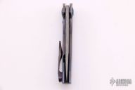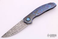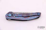 This Orso flipper by Jens Anso features a Damasteel blade with notched flipper. The handle has a fine, checker milled and zircuti frame, zirconium inlay, pivot collars and backspacer with lanyard hole, zircuti pocket clip that is positioned for tip up carry. This piece has a stainless steel lockbar insert and over travel stop. Rides on bearings. Nice detent, lockup and blade seating. This is a stunning example of Mr. Anso's talent. Comes with custom padded pouch and original box. Excellent condition.