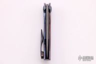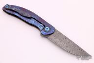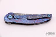 This Orso flipper by Jens Anso features a Damasteel blade with notched flipper. The handle has a fine, checker milled and zircuti frame, clip and backspacer, zirconium pivot collars. This piece has a stainless steel lockbar insert and over travel stop. Rides on bearings. Nice detent, lockup and blade seating. This is a stunning example of Mr. Anso's talent. Comes with custom padded pouch and original box. Excellent condition.
