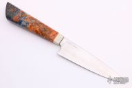 This Utility by Edward R. Knives features a hand rub satin finished blade with .108" blade stock and 1.280" blade depth. The handle has is dyed and stabilized box elder burl with an orange/blue G-10 frame and white G-10 bolster. New from maker.