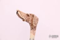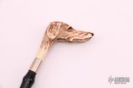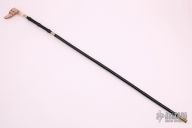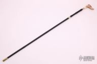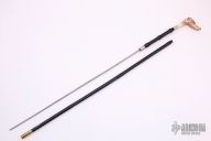 This sword cane by WC Johnson features a bamboo shaft, steel fittings and a carved bone dog head handle. Inside is a dagger blade. The shell of a S&M 44 is mounted to the bottom. Scuffs and scratched are visible on the blade, scabbard and handle.  This is a cool piece however it is not very sturdy.