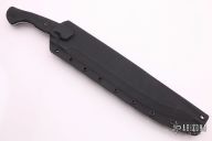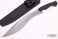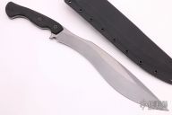 ure fighter, this model harks back to battle blades such as the Nepalese kukri, Turkish yataghan, and Greek kopis. Its deep belly and recurve makes for a devastating chopper, but the spear-like tip also excels at piercing. Textured and contoured G10 scales provide optimum grip, slim enough to pack without sacrificing tactility and comfort. Under the scales, the tang is skeletonized to reduce weight and facilitate my ideal overall balance. We machined these a little differently than previous models, choosing subtle perpendicular bevel striations that allow for efficient material hogging and also look really nice (IMHO). CMP-3V is an extremely tough steel, allowing for a very acute edge angle, making this short sword an exquisite slicer. Finally, the included Kydex sheath is finished off with a pivoting Blade-Tech Tek Lok®, which makes for a smooth draw from belt carry and makes maneuvering in tight spaces much easier.
