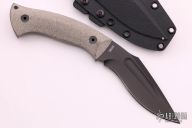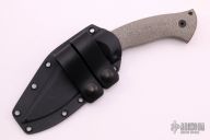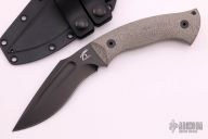 This Kukri features a black blade with a false top edge and a full tang construction. .235" Blade Stock. 1.385" Blade Depth. The handle features micarta scales. Includes a blade kydex sheath and the original box. New from maker.