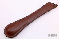 Since 2003 D3, Protection has been a maker of hand made high quality leather goods including saps & blackjacks, and impact weapons. Ranging from key chain saps and coffin flat saps to aluminum batons. Every item is made by David Doerr, in western Canada. Using only the finest leather and hardware available. These leather pieces are made of excellent quality materials and craftsmanship."D3 Protections flat saps, Finger saps and blackjacks are all made of the highest quality American made leather tanned by Herman Oak and are built for many years of loyal service. Flat saps consist of a flat spring with a lead ingot casted to it, this is known as the "frame". The frame is then covered with multiple layers of thick leather and sewn through all the layers. D3 Protections blackjacks are all made around custom made frames casted by me. The frame is then wrapped with various types and thicknesses of leather." These are some fantastic paper weights! Shown here is a 11" D3 Protection Texan made from four layers of leather. The color is oxblood with oxblood edges, The strap is a double strand four thong flat braid and it has conventional rivets, Total weight of 14oz. The strap on this one is broken, otherwise excellent condition.