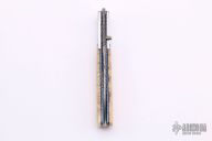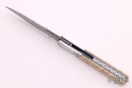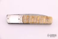 "I started making knives over 30 years ago while at University. My first knife was a big Bowie made from a car spring and I obtained a piece of stag from the local zoo for the handle. I still have and treasure that first knife. In my younger days I was very involved in martial arts yet could not buy Japanese weapons to train with, so I made my own, a short sword called a "sai". My fellow students were enthralled and I began taking orders to make more. Although having earned two university degrees, I continued to make knives part-time, but it became such a passion that I left my profession and am now a full-time knifemaking artist. I have been a member of the South African Knifemakers Guild since 1985. Today I only make folders and automatics, using the best exotic materials such as mammoth ivory, pearl, damascus and damasteel. All my folders have fileworked liners and backstraps, each folder has a jewel inlaid somewhere on the knife as well as in the thumbstud."