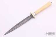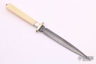 This Prostitute Dagger by Jesse Davis features a double edged Damascus blade with .136" blade stock and .654" blade depth, hidden tang construction. The handle has a fileworked brass guard, bone handle and nickel silver collar. Has a few light scratches, otherwise excellent condition.