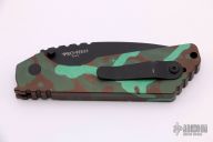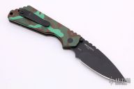 This Pro-Strider SNG by Pro-Tech and Strider Knives features a black blade with notched thumbrest. The handle has a camo aluminum frame with black hardware and black stainless steel tip up clip.  Comes with a Pro-tech box, sheath and papers. Excellent condition.