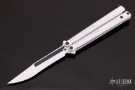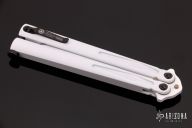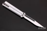 This Tachyon III balisong by Marfione Custom Knives has a white clip point blade with sharpened top edge. The handles are white titanium with spring latch and black tip up pocket clip, black hardware. Rides on bearings, no blade play, very smooth. S/N 00280. Excellent condition.