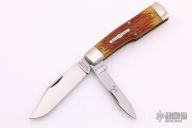 This Buffalo Jack by Great Eastern Cutlery features two satin finished blades with nail nicks. The handle has front and rear nickle silver bolsters, golden jigged bone covers with brass liners, stainless steel springs. Has half-stops. Comes with original tube.   Excellent condition.