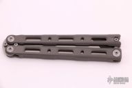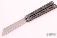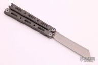 This Model 87 Balisong by Benchmade features a tumble finished wharncliffe style blade. The handle is comprised of an integrally constructed, skeletonized titanium frame with bead blast finish. Spring loaded T latch on pommel. Has some scuffs, otherwise excellent condition.