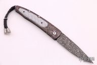This B10 Alpine button lock folder by William Henry Knives features a Rob Thomas "Dot Matrix" Damascus blade with a single thumbstud with a sapphire inlay. The handle has a head colored Chad Nichols "X-Out" Damascus frame with silver twill inlays, push button with sapphire inlay, lanyard bail with sterling silver bail and beads. Includes original box, sheath and certificate of authenticity dated March 28, 2012. Excellent condition.