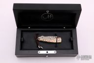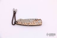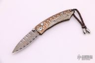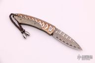 This B04 WMMC by William Henry features a "Copper Wave" VG-5 core San Mai Damascus blade and single thumb stud with white topaz inset. The handle is comprised of a heat browned "Wave"mokume frame with mammoth bone inlays over stainless barrel spacers. White Topaz inset on button lock and lanyard hole with leather lanyard in pommel. Includes leather sheath with pocket clip and original box and paperwork. Excellent condition.