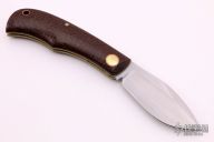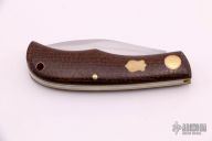 This slipjoint by Chris Taylor features a hand rub satin finished blade. The handle has pinched burlap micarta covers, brass liners and a satin stainless steel spring.  Mammoth ivory Shield.   Has half-stop, flush in all positions. Comes with a zippered case and COA dated 3/26/21. New from maker at the 2021 ICCE Show.
