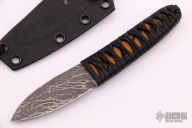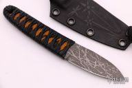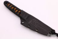 This Maguru from Lucas Burnley features an acid tumble finished blade, .143" blade stock and .946" blade depth, hidden tang construction. The handle has black cord wrap over orange/black stingray skin. Comes with a kydex sheath. Has a couple small oxidation spots, otherwise excellent condition.