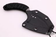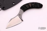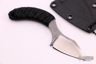 This CAL by Bastinelli Knives features a sheepsfoot style blade with a notched thumbrest.  The handle has black wrap over black cord underwrap with bronze menuki. Comes with kydex sheath with bead chain. Comes with a padded zippered case. New from maker.