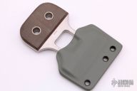 This knife by Shane Sibert features a satin finished blade with .189" blade stock and a 2.5" blade, full tang construction with green canvas micarta scales and red liners. Comes with a kydex sheath. Excellent condition.