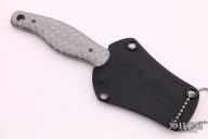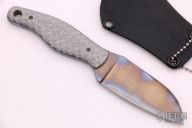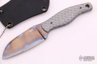 This titanium neck knife by Gerry McGinnis has an anodized and orange peel finished titanium blade with notched thumbrest and silver twill scales with lanyard hole, .157" blade stock and 1.087" blade depth. Excellent condition. Comes with kydex sheath.