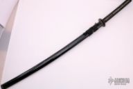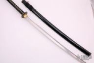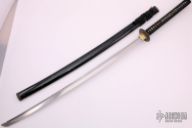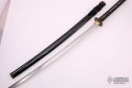 The Tiger Katana by Paul Chen of Hanwei Forge features a forged and differentially hardened in the traditional claying method with a prominent hamon, K120C powder steel, has fullers, .295" blade stock and 1.268" blade depth, hidden tang construction. The handle has a brass habiki and brass seppas, textured brass fuchi, has a black wrapped tsuka with white stingray skin and brass menuki, textured brass kashira. The Saya is black lacquered wood with gold leaf embelishments. Comes with original sword bag, papers and box. Excellent condition.