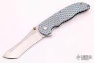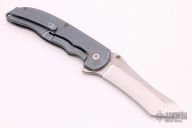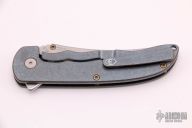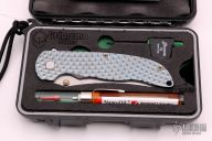 This Norseman (#2543) by John Grimsmo features a tumble finished blade with a single anodized titanium thumb stud, notched thumb ramp and flipper. Tumble finished and anodized titanium frame with a textured front scale and anodized titanium screws. Very smooth action that requires no wrist movement. Nice detent, lockup and blade seating. Rides on ceramic bearings. Knife is in excellent condition, shows no signs of use or carry. Comes with original packaging, custom hard case, Nano-Oil, tool, and COA dated July 17, 2019.
