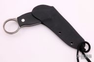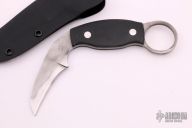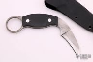 This karambit by Del Blue features a hawkbill blade with hamon, .159" blade stock and .915" blade depth, full tang construction with black G-10 scales. Comes with a kydex sheath and zippered case. Has some scratches, otherwise good condition.