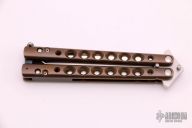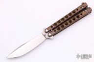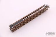 This Balisong by Charles Marlowe features a hand rub satin finished Chinese Scimitar style blade. The handles are anodized titanium with hole pattern, black/white G-10 spacers and T-latch. This is a beautiful balisong, features IKBS. Excellent condition. "IKBS" and "BL06" on the blade tang. Comes with velcro case. Originally from the 2006 Blade Show.
