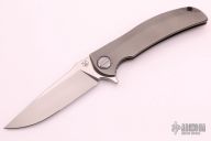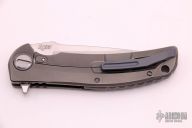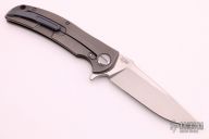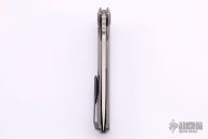 This Russian Overkill by Shirogorov and RJ Martin features a M398 blade with notched thumbrest and a flipper. The handle has a blasted and milled titanium frame, darkened titanium pivot collars, backspacer and tip up clip with hidden screws. Has RBS, nice detent, lockup and blade seating. Comes with original box and papers. Excellent condition. #197/200