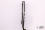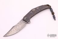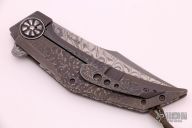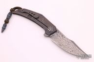 This XL Xerxes by Gudy Van Poppel features an INOX Damascus blade by Marcus Ballbach, false top edge and a flipper. The handle has a hand carved titanium frame done by Gudy, it is tumble finished, has a matching tip up clip, fileworked and tapered titanium backspacer, hand carved 440C pivot done by Gudy, lanyard at the butt with custom titanium beads done by Gudy. Nice detent, lockup and blade seating, rides on ceramic bearings and has a ceramic pivot. Comes with a zippered case. Originally from the 2019 Blade Show. Excellent condition.