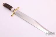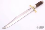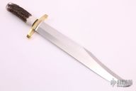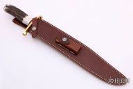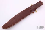The 13" Randall Thorp Bowie by Randall Made Knives is similar to types used by Confederate troops. This one has an 13" carbon steel blade with sharpened top edge, .201" blade stock and 1.647" blade depth, hidden tang construction. The handle has a brass lugged guard and scalloped butt cap, stag grip with black spacers. Comes with a brown leather sheath and a zippered case. Excellent condition.