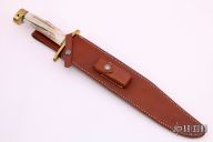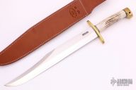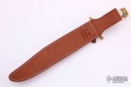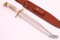 The 13" Randall Thorp Bowie by Randall Made Knives is similar to types used by Confederate troops. This one has an 13" carbon steel blade with sharpened top edge, .206" blade stock and 1.681" blade depth, hidden tang construction. The handle has a brass forward curved guard and butt cap, stag grip with black/brass spacers. Comes with a brown leather sheath and a zippered case. Excellent condition.