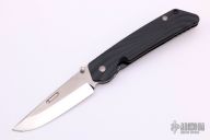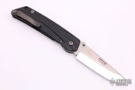 "The blade is convex on both sides in the tradition of the highly praised Japanese sword. This shape is both sharp and strong, and can still slice paper even after the 1,000 of hemp rope cuts. Using this blade form is one superb method of making an edge thick without losing of its sharpness. This is a knife of preeminent sharpness. You can enjoy its strong cutting capabilities for a long time. Even if used for rigorous cutting, the blade will not bite thanks to its convex shape. Other knives often will bite, and may nick if it is pulled out suddenly at that time. This knife scratches the plate of china. Please do not use it to cut food on the plate." The handle is sculpted black aluminum and tip up black stainless steel clip. Comes with original box and papers. Excellent condition. #953 on blade.