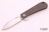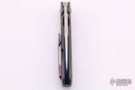 This Barlow flipper from Enrique Pena features a hand rubbed, satin finished blade with swedge and notched flipper. The handle has a bead blasted titanium frame with faux bolsters and jigged pattern, blue anodized backspacer with a bead blasted timascus clip that is positioned for tip up carry. Nice detent, lockup and blade seating. Light scratches on the clip, otherwise excellent condition. Comes with a zippered case.