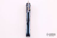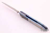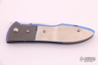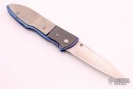 This Phantom by Allen Elishewitz features a satin finish blade with chisel grind and hollow ground backside, and single knurled thumb stud, sharpened top edge. Anodized titanium liners with orange peeled titanium scales and bead blasted titanium bolsters. Nice blade seating, and lockup. Has a few light scuffs, otherwise excellent condition. Comes with a velcro case.
