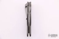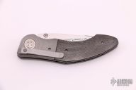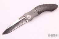 This linerlock by Allen Elishewitz features a Damasteel blade with satin finished flats and a stepped thumbstud. The handle has Guilloche worked and bead blasted titanium bolsters, carbon fiber scales, bead blasted titanium liners, black G-10 backspacer, tip down bead blasted stainless steel clip. Comes with a zippered case. Nice detent, lockup and blade seating. Excellent condition.