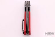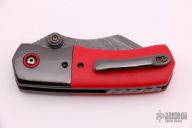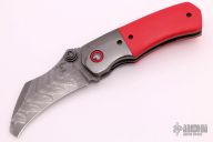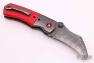 This knife by Jonathan McNees features a hawkbill San Mai Damascus blade with notched thumbrest and dual zirconium thumbstuds. The handle has zirconium bolsters, red carbo quartz scales and pivot collars, zirconium backspacer and tip up clip. Rides on bearings, nice detent, lockup and blade seating. Comes with a zippered case. Excellent condition.