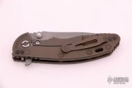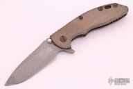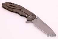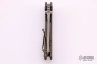 This XM-18 by Rick Hinderer features a working finished blade with notched thumbrest and flipper. The handle has a titanium frame, a micarta scale, a tip up or down reversible stonewashed and anodized titanium clip and a lanyard hole at the butt. Excellent condition. Comes with original box and extra hardware.  Excellent Condition.