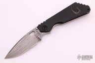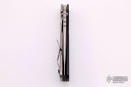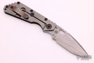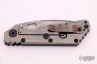 This SMF by Mick Strider features a laser engraved blade with thumbhole and notched thumbrest. The handle has laser engraved black aluminum and titanium frame and tip up titanium clip, has black hardware and an anodized titanium lockbar stabilizer. Notches on thumbrest, rear of handle. Nice detent, blade seating and lockup. New condition.