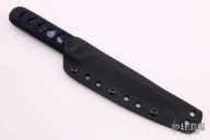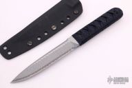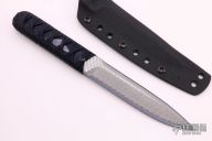 This Yori Toshi by Warren Thomas features a fingerprint anodized titanium blade with silver twill laminate, sharpened top edge, .358" blade stock and 1.113" blade depth, hidden tang construction. The handle has stingray skin under black Japanese style wrapping. Comes with kydex sheath. Excellent condition.