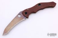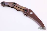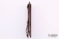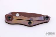 This prototype T-Rex by Warren Thomas features an anodized titanium and brown canvas micarta blade with carbide edge. The handle has a brown canvas micarta scale and an anodized titanium lockside. Has matching tip up clip. Nice detent, lockup and blade seating. Has some scratches, otherwise good condition.