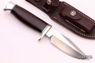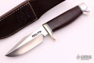 This Model 23 "Gamemaster" by Randall Made Knives features a satin finished clip point blade with sharpened top edge and a notched thumbrest, .225" blade stock and 1.308" blade depth hidden tang construction. The handle has a nickel silver guard, black linen micarta grip with duralumin/black spacers, duralumin butt. Comes with a waxed brown leather sheath with stone. New condition. Comes with original paper wrapping.