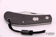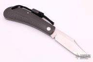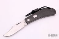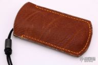 This Lanny's Clip from Pepe Jalomo features a satin finish clip point blade with a single nail nick. The handle is comprised of textured burlap micarta covers over stainless steel liners with a stainless steel escutcheon. Stainless steel backspring. Lanyard hole with lanyard and micarta bead. Includes a brown leather slip sheath. Excellent condition.