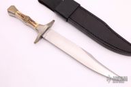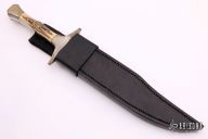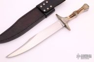 This Bowie by RJ Kessnick features a hand rub satin finished blade with a sharpened top edge, .245" blade stock and 1.391" blade depth, full tang construction. The handle has a nickel silver guard and butt, stag scales. Comes with a black leather sheath. Has some patina on the nickel silver, has some light scratches on the blade, otherwise good condition.